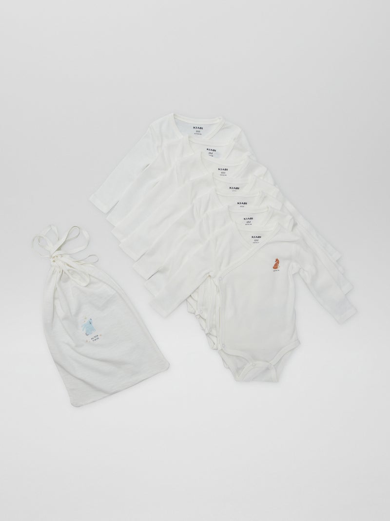 Préparez la garde-robe de votre bébé avec notre lot de 7 bodies, accompagné d'un pochon de rangement.