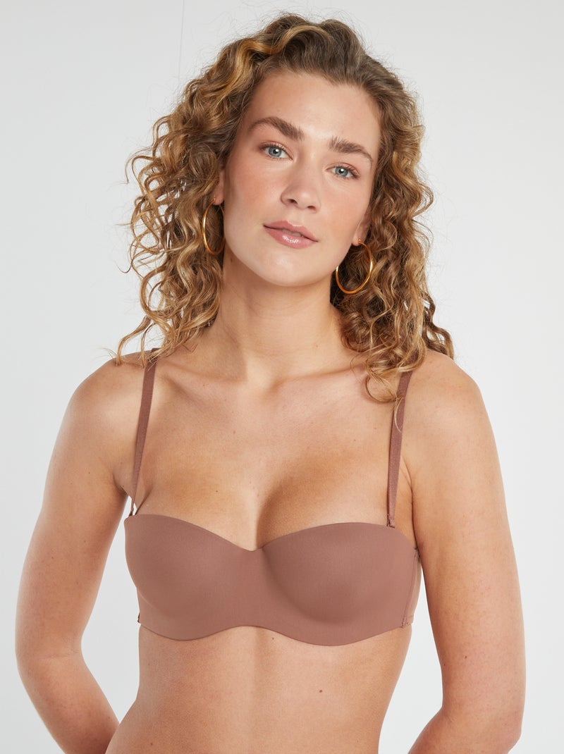 Le bandeau moulé qui se porte de façon invisible sous les vêtements grâce à son style sans coutures. - Bandeau moulé - En microfibre - Effet invisible - Coques souples intégrées - Fines bretelles amovibles et ajustables - Armatures sous poitrine - Baleines latérales - Biais de protection intérieur - Triple agrafage quatre positions au dos - Notre mannequin porte une taille 90B et mesure 1m79