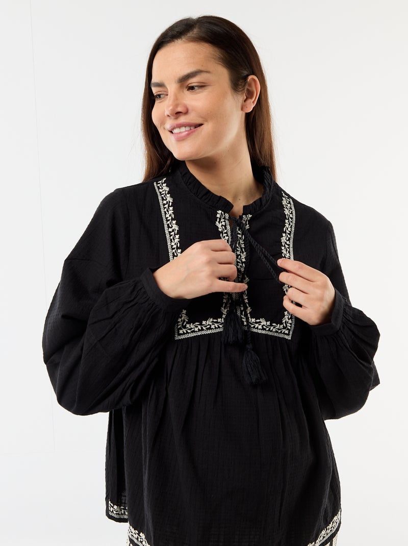 La blouse plus que facile à porter avec sa coupe évasée et ses broderies fantaisies.