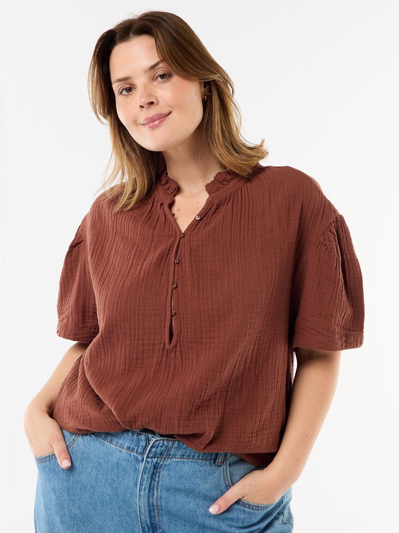 Une blouse qui arbore une jolie matière en gaze de coton pour un rendu vaporeux.