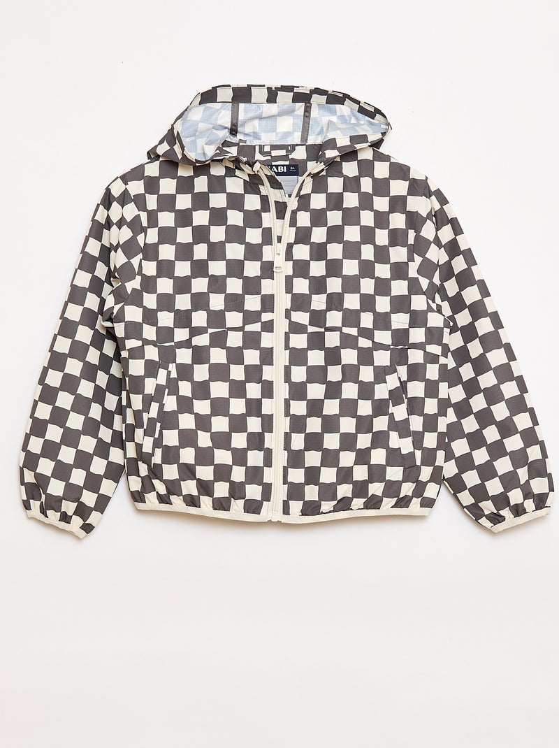 Un blouson coupe-vent à capuche conçu pour protéger du vent et de la pluie, avec des détails pratiques.