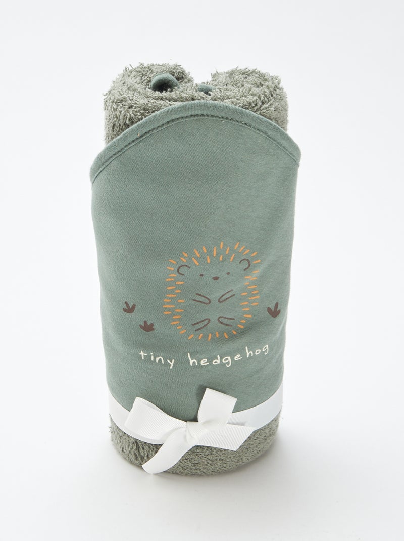 Une jolie cape de bain avec un bel imprimé pour bébé à la sortie du bain.