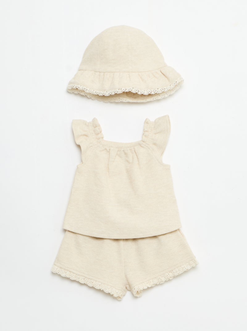 Ensemble 3 pièces en maille côtelée - short + T-shirt + bob - Beige