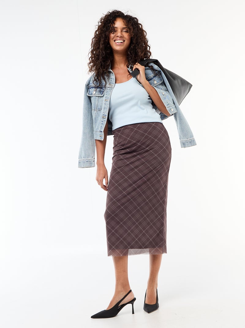 Jupe longue en mesh à carreaux - Marron