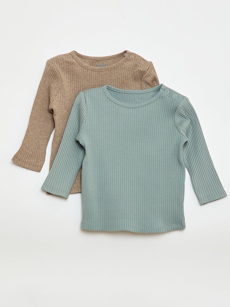 Lot de 2 t-shirts unis côtelés à manches longues - Beige/bleu