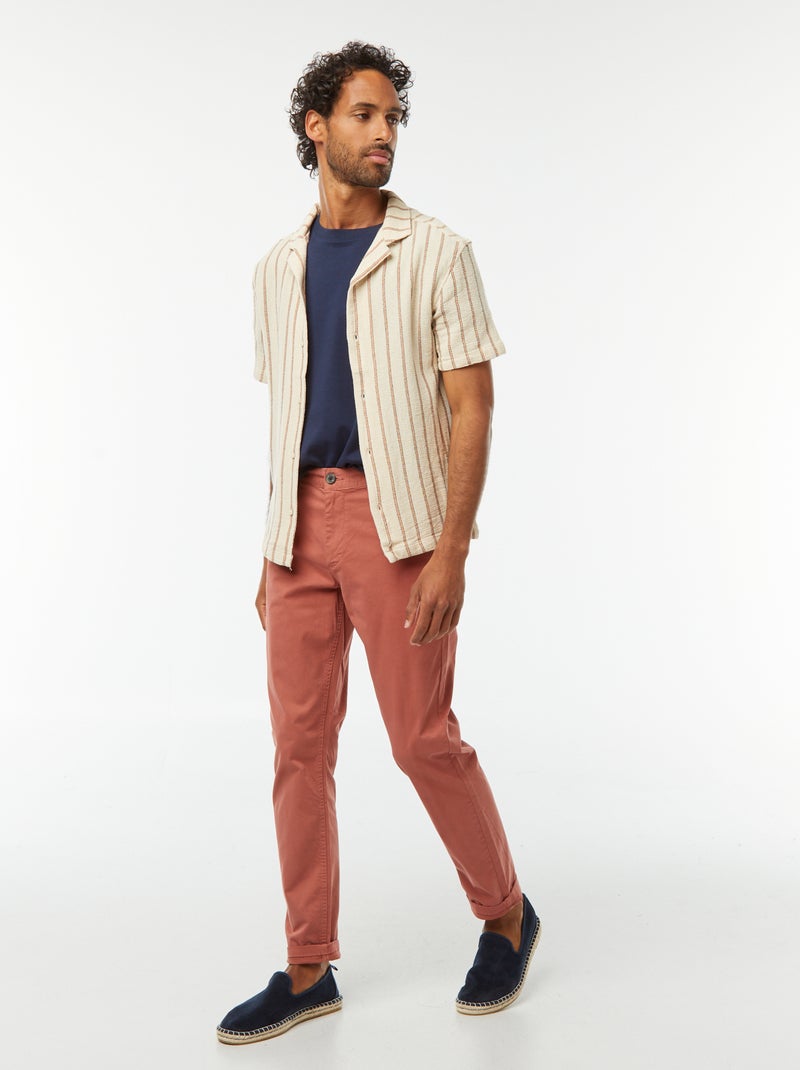 L'incontournable chino revu et corrigé en coupe slim, et dans un beau twill de coton stretch. A porter roulotté au bas des jambes pour un petit look casual chic au top ! ;-)