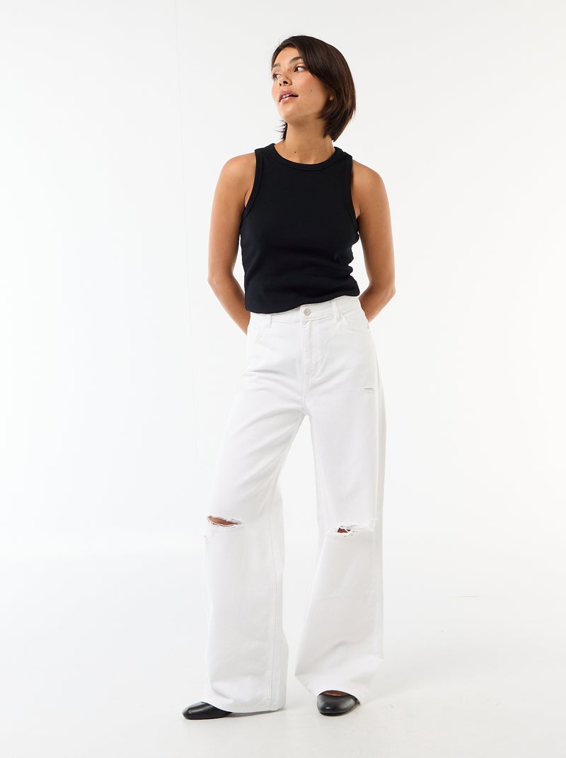 On joue subtilement la rebelle avec ce pantalon wide leg et ses abrasions effet destroy.
