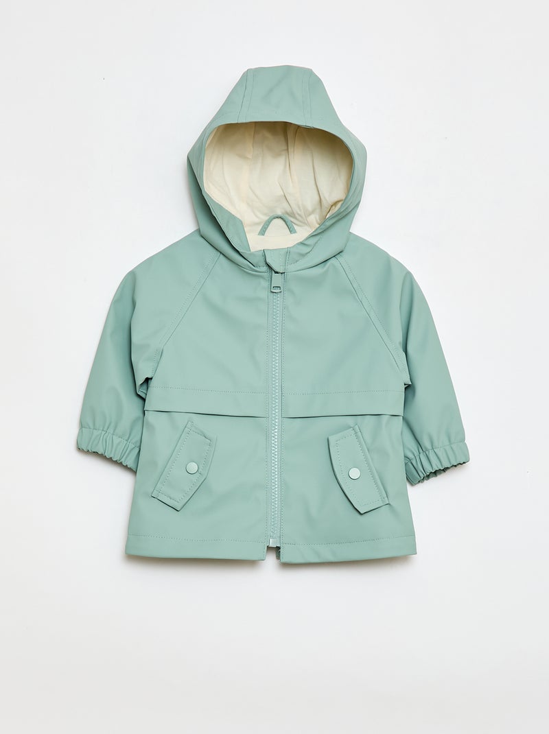 Une parka en caoutchouc à capuche conçue pour protéger de la pluie, avec une coupe fonctionnelle et des détails pratiques.