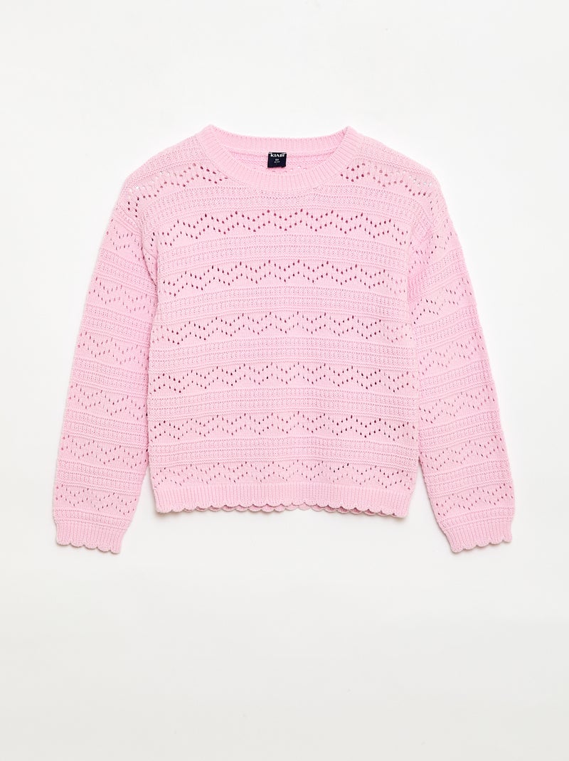 Pull col rond maillé fantaisie avec motifs ajourés en coton - Rose
