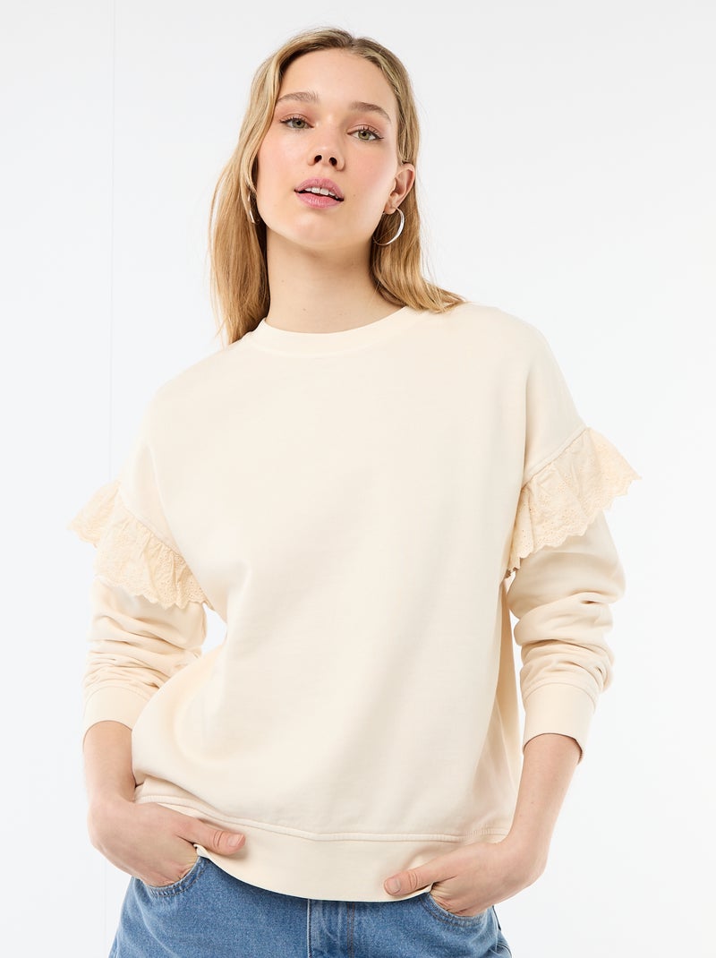 Sweat uni avec volants en borderies anglaises sur les manches - Blanc