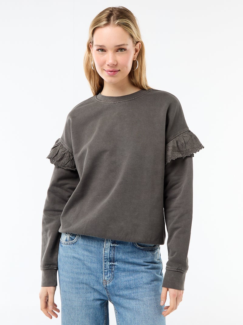 Sweat uni avec volants en borderies anglaises sur les manches - Gris