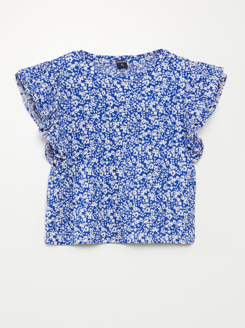 T-shirt à manches courtes volantées et à col rond avec imprimé - BLEU