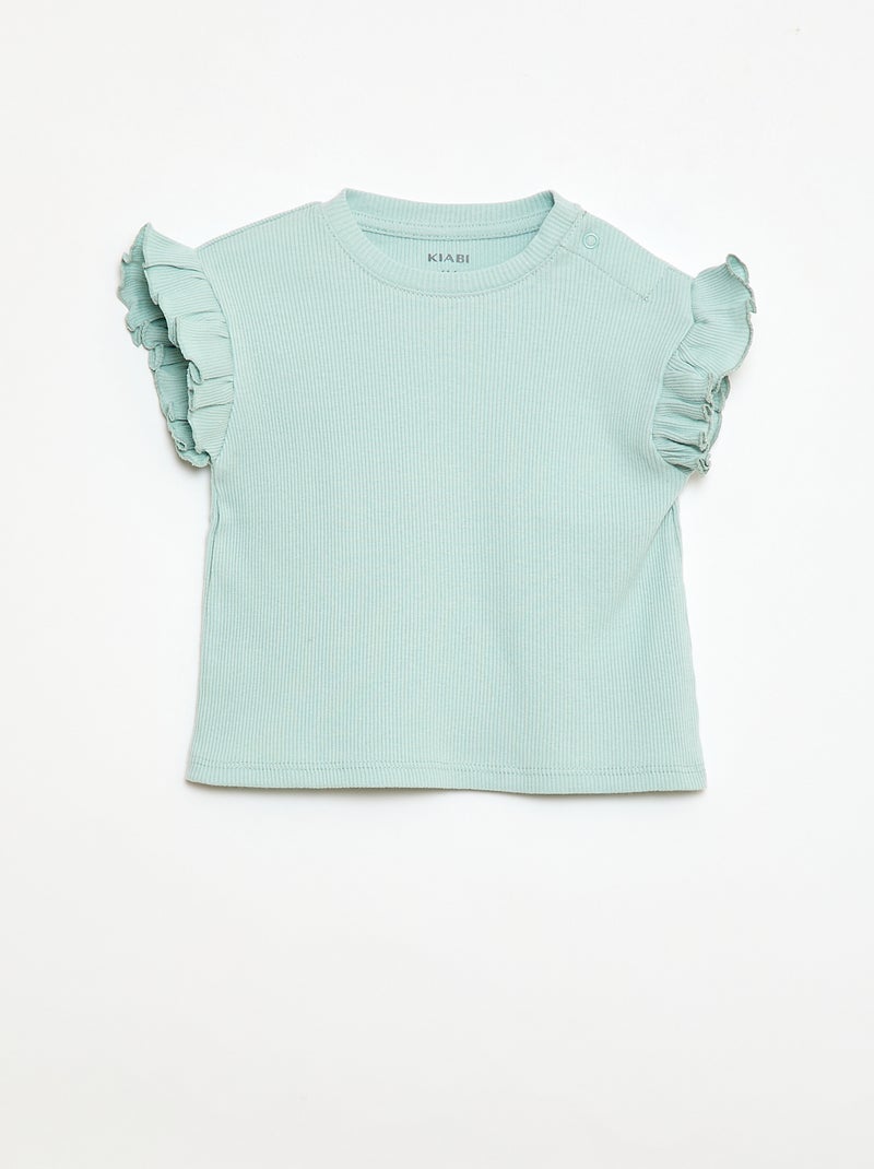 T-shirt côtelé à manches courtes volantées - Bleu