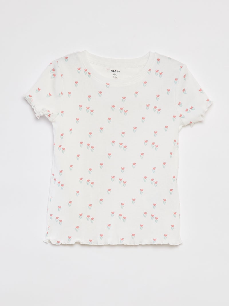 T-shirt côtelé avec bords ondulés et motifs - BLANC