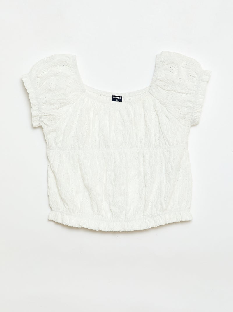 T-shirt effet smocké avec broderie en anglaise - Blanc