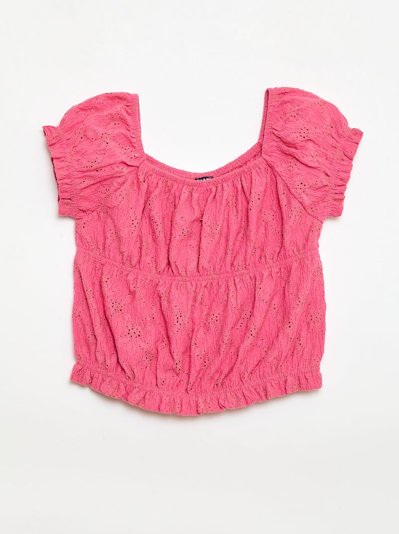 T-shirt effet smocké avec broderie en anglaise - Rose