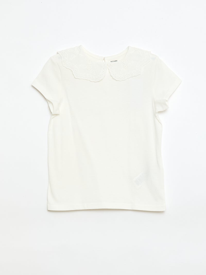 T-shirt en jersey avec col Claudine avec broderies anglaises - Blanc