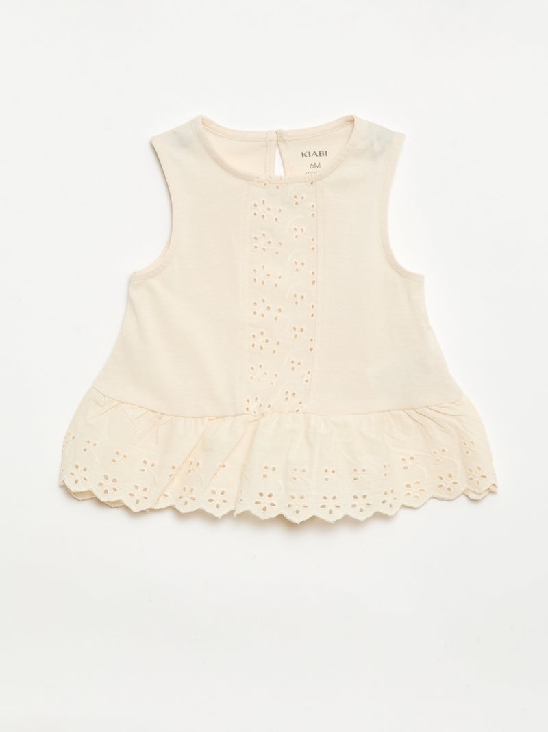 T-shirt sans manches en jersey de coton et détails en broderie anglaise - Ecru