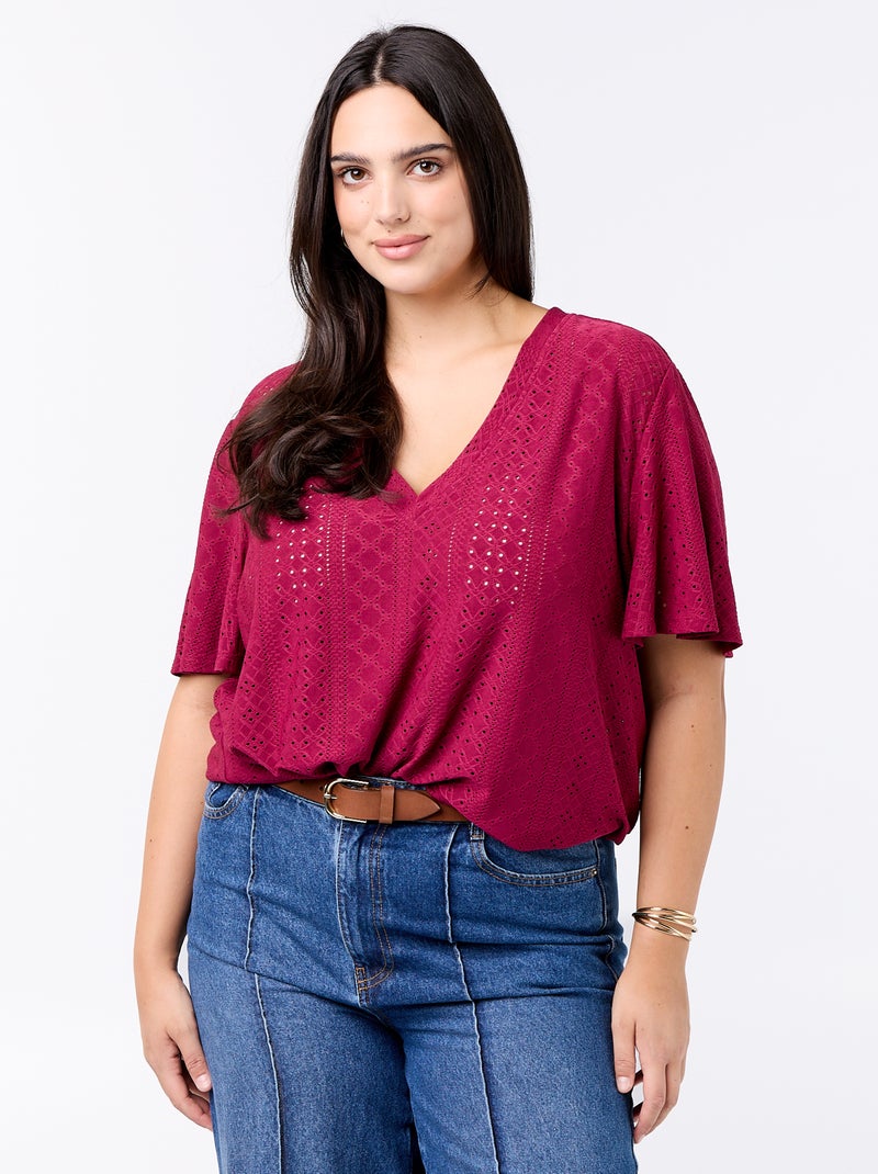 Tee-shirt uni en maille ajourée - Rouge
