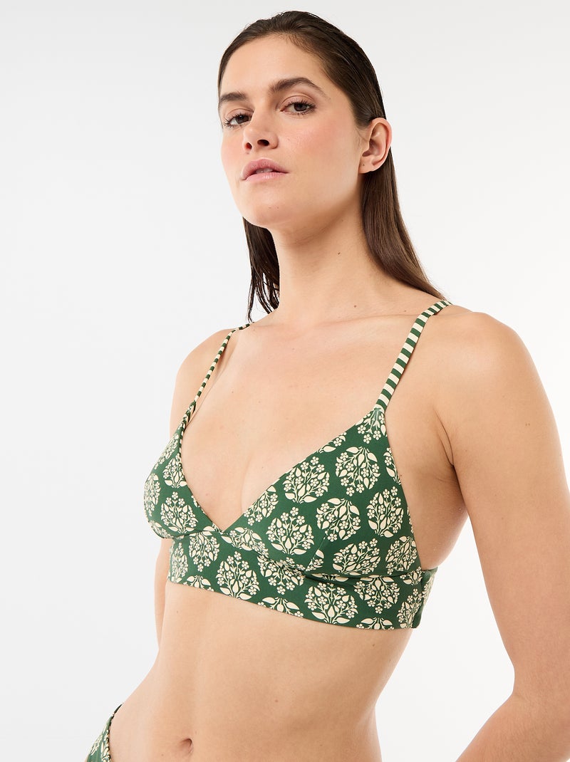 Un triangle de bain 2-en-1 avec sa coupe réversible : un jour en rayures l'autre jour en imprimé.