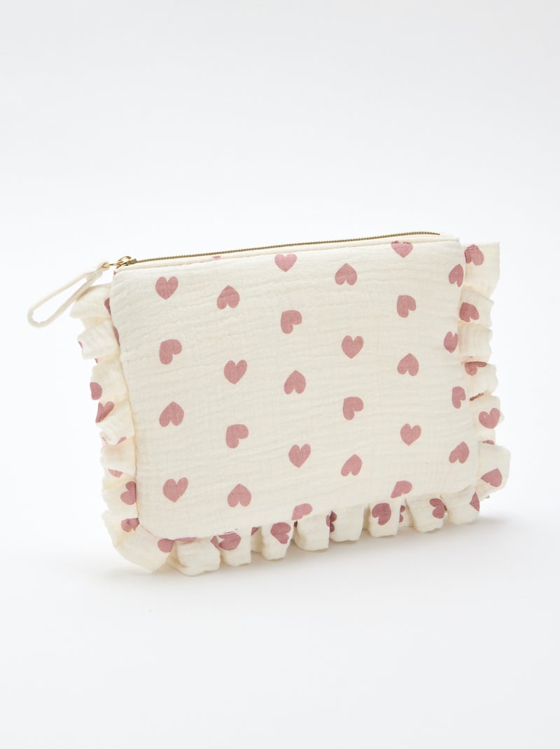 La trousse de toilette qui cumule les atouts charme : matière en gaze de coton, motif coeurs, bords effet froufrous.